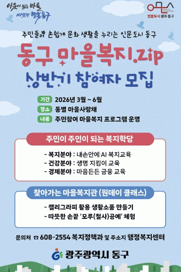 [한국저널뉴스]광주 동구는 주민 누구나 일상 속에서 복지를 배우고 참여할 수 있는 ‘동구 마을복지.ZIP’ 사업을 오는 3월부터 본격 추진한다고 밝혔다.