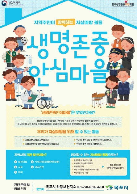 [한국저널뉴스]목포시는 지역사회 중심의 자살예방 안전망 구축을 위해 보건복지부 제5차 자살예방 기본계획에 따른 ‘생명존중 안심마을 조성 및 운영’ 사업을 단계적으로 확대하고, 2026년도 신규 참여기관 및 단체를 모집한다고 밝혔다.