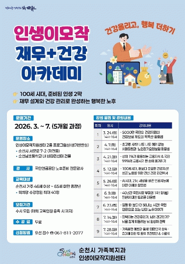 [한국저널뉴스]순천시는 중·장년층의 삶의 설계와 안정적인 노후 준비를 돕기 위해 ‘재무·건강 아카데미’ 수강생을 3월부터 7월까지 수시 모집한다고 밝혔다.