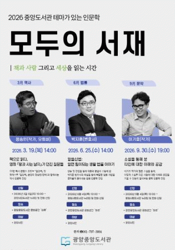 [한국저널뉴스]광양중앙도서관이 시민의 인문학적 소양을 높이고 독서문화를 확산하기 위해 3월부터 9월까지 명사 초청 인문학 강연 '모두의 서재'를 운영한다.