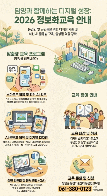 [한국저널뉴스] 담양군은 지역 농업인의 디지털 소통 능력을 키우고 스마트한 농촌 환경을 조성하기 위해 ‘2026년 농업인 정보화 교육’을 추진한다.