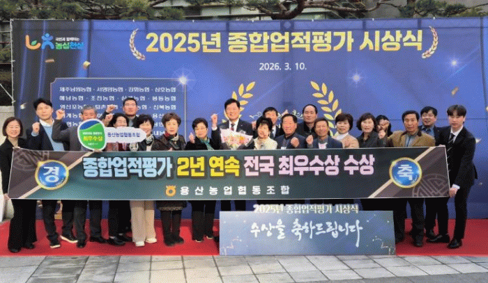 [한국저널뉴스]용산농협은 지난 3월10일 농협중앙회 본부 대강당에서 열린 ‘2025년 종합업적평가 최우수 농·축협 시상식’에서 종합업적평가 최우수상 수상과 클린뱅크 금 등급을 수상하는 영예를 안았다.