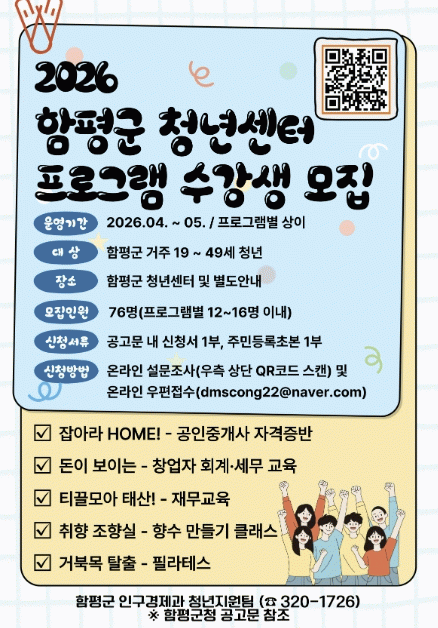 함평군은 24일 “‘2026년 상반기 청년센터 프로그램’의 참여자를 선착순으로 모집한다”고 밝혔다.