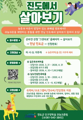 진도군 관계자는 “귀농, 귀어, 귀촌을 희망하는 분들이 이번 사업을 통해 농어촌 생활을 직접 경험하고, 안정적인 정착을 준비할 수 있기를 기대한다”라며, “보배섬 진도에서 새로운 삶을 시작할 수 있도록 적극 지원하겠다”라고 말했다.