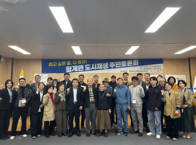 [한국저널뉴스] 전남 무안군은 청계면 도시재생 주민토론회를 주민, 학생, 관계 전문가 등 50여 명이 참석한 가운데 지난 3월 31일 청계면사무소 2층 대회의실에서 개최했다고 밝혔다.