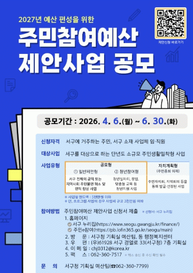 [한국저널뉴스]광주광역시 서구가 실질적인 주민주권 강화를 위해 ‘주민참여예산 제안사업 공모’를 6월 30일까지 진행한다. 이번 공모는 내년도 예산에 반영할 주민 제안사업을 모집하는 것으로 이달 6일부터 접수를 시작한다.
